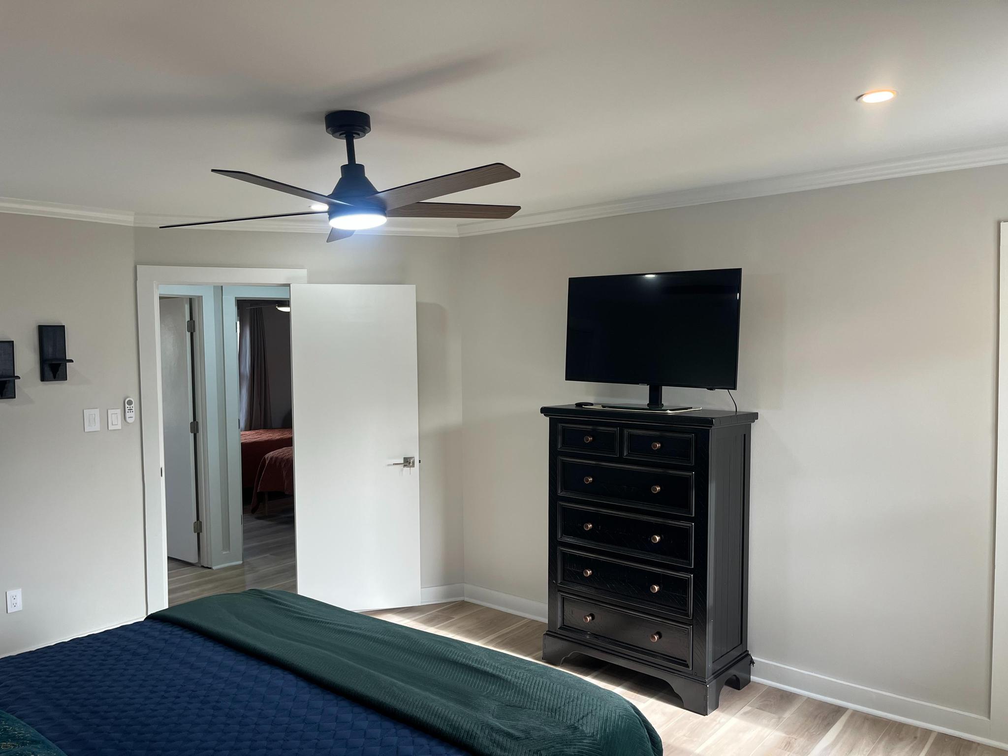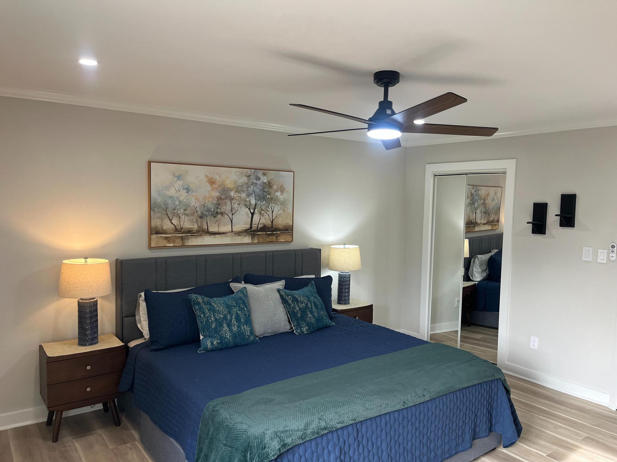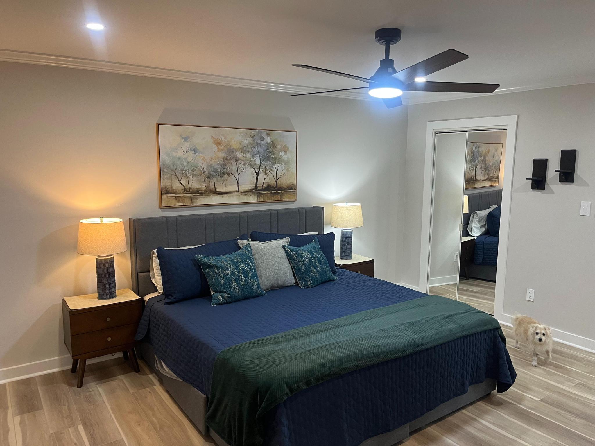 Primary Suite: Features a plush King bed, a private en-suite bathroom with a walk-in shower, and a dedicated 55" electronically adjustable standing desk with an ergonomic office chair—perfect for remote workers!