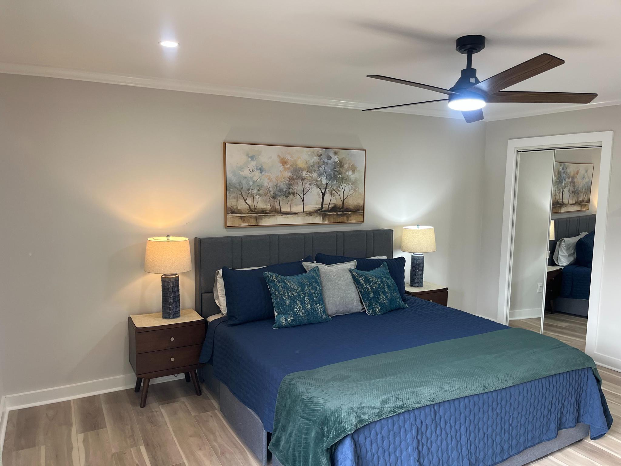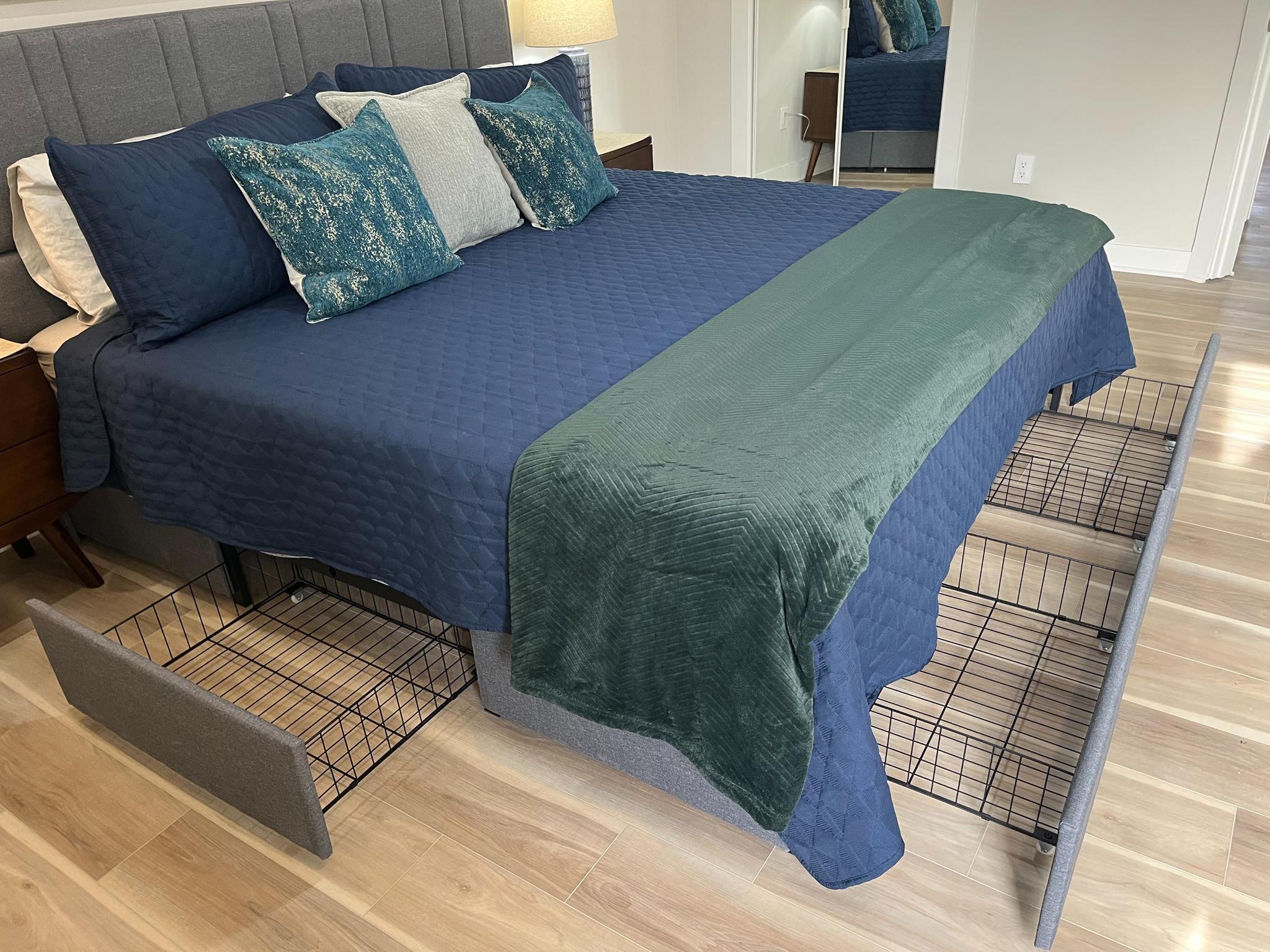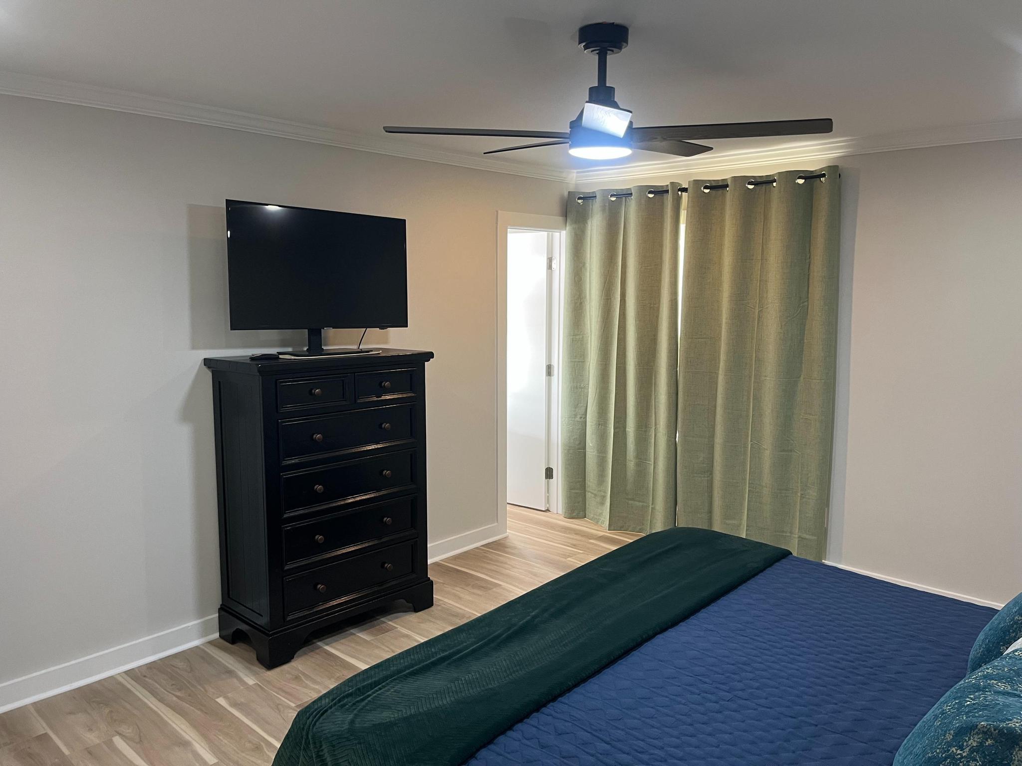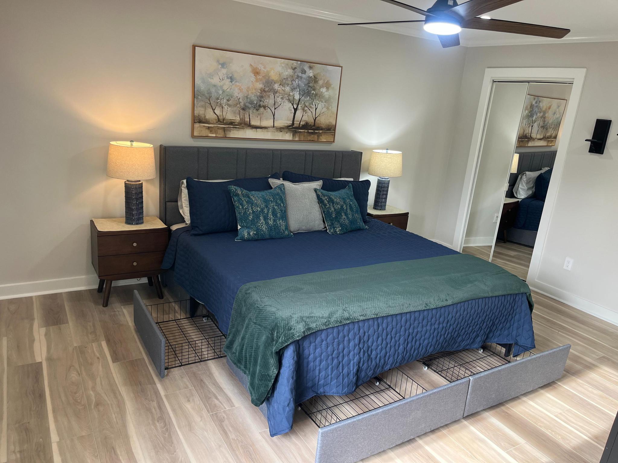 Primary Suite: Features a plush King bed, a private en-suite bathroom with a walk-in shower, and a dedicated 55" electronically adjustable standing desk with an ergonomic office chair—perfect for remote workers!